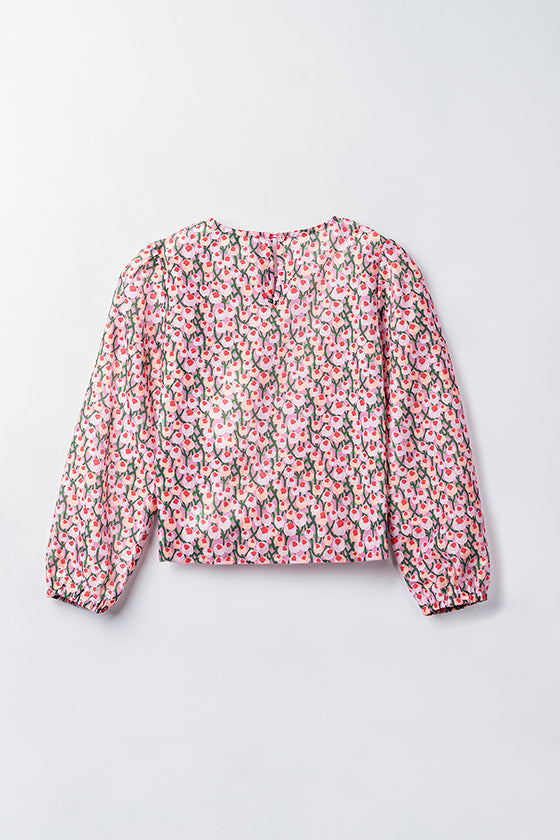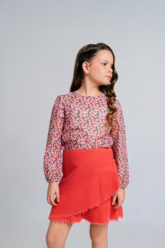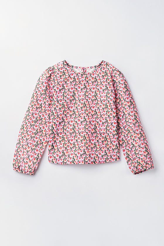 Blusa manga larga en estampado floral y detalles de recogido en hombros y puños. Su silueta atemporal y tela fresca la hacen ideal para combinar con diversas prendas. Una opción versátil y suave que aporta color y estilo al armario de las niñas.