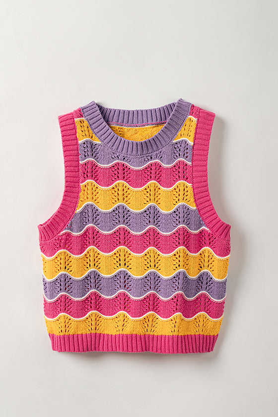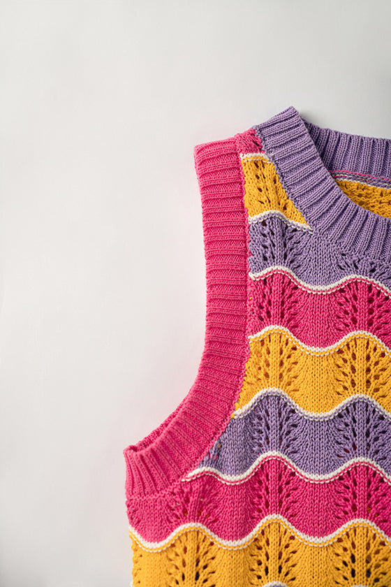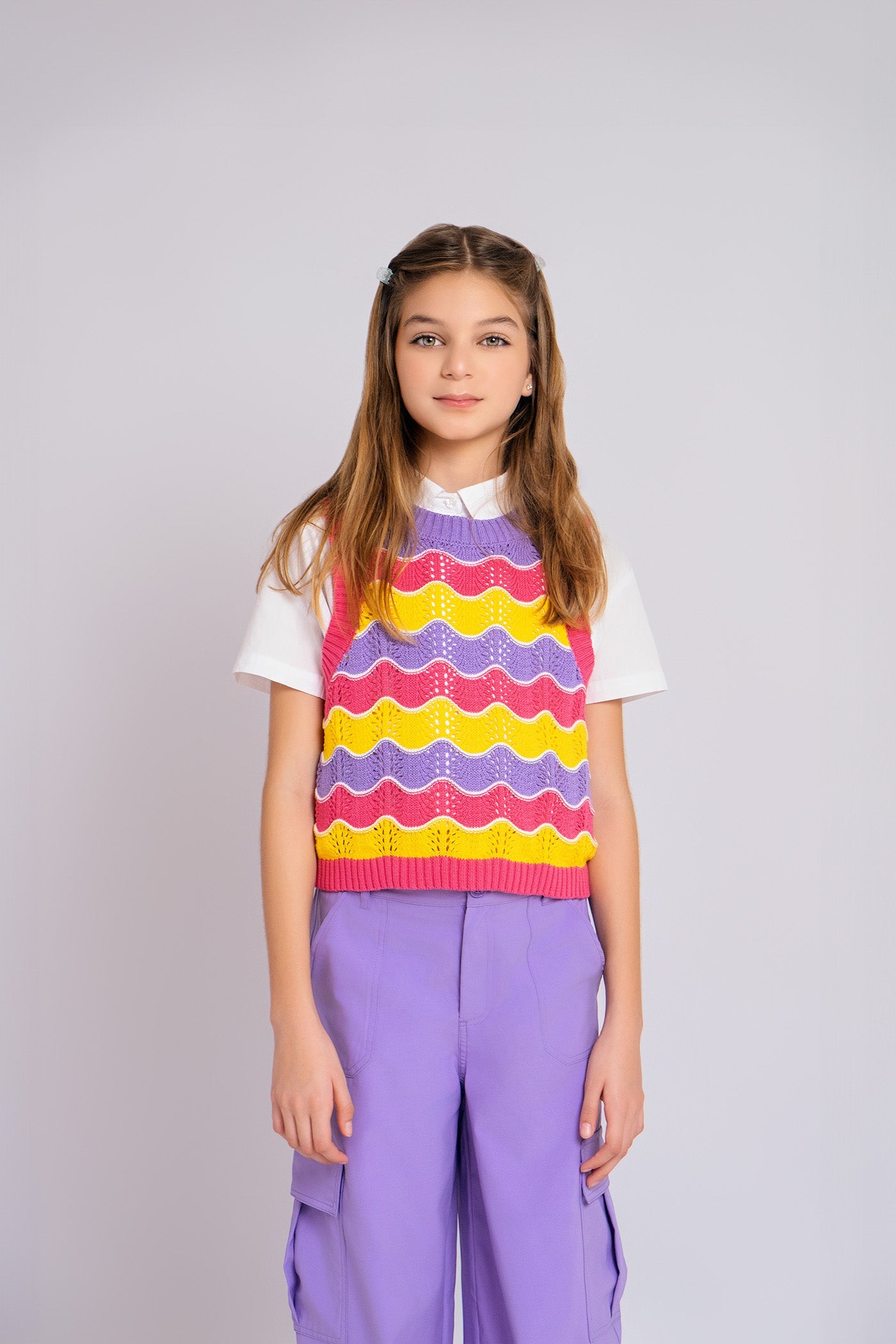 Vest tejido para niñas con cuello redondo y detalles en contraste en cuello y puños Elena. Diseñado en fibras de algodón, combina comodidad y estilo en una prenda perfecta para complementar cualquier atuendo, añadiendo una capa vibrante y moderna a los looks diarios o eventos especiales.