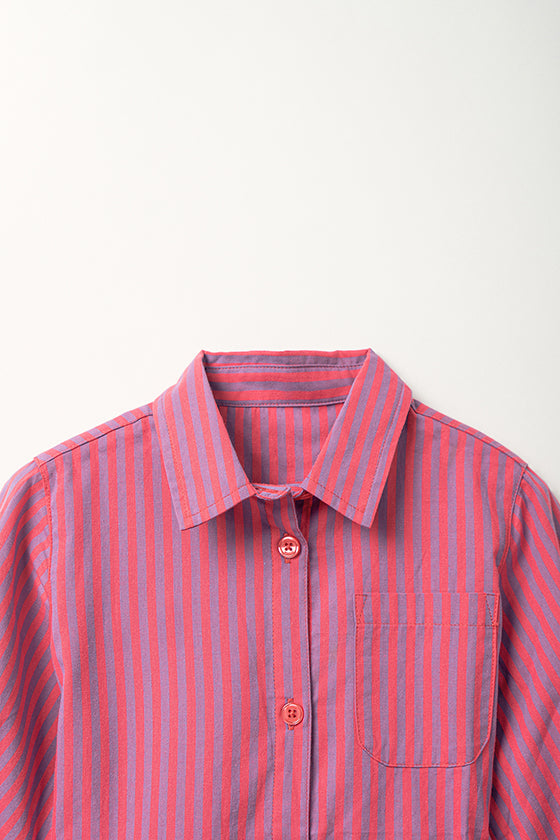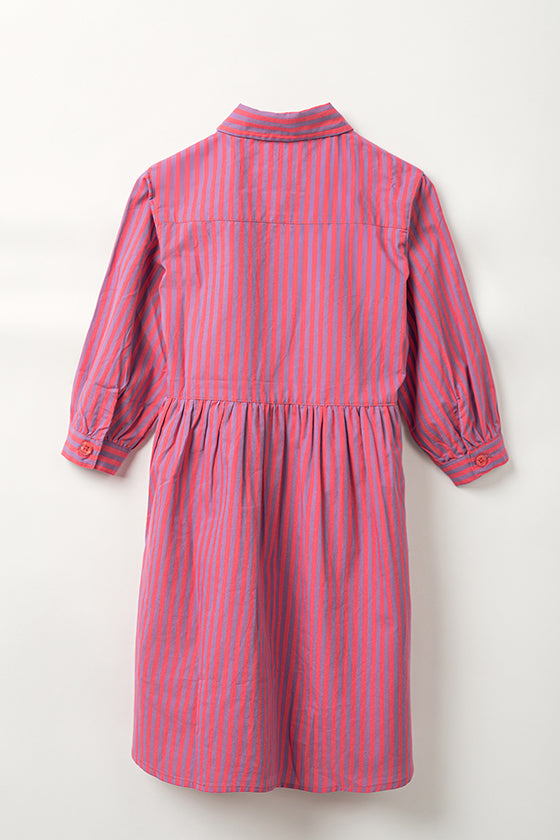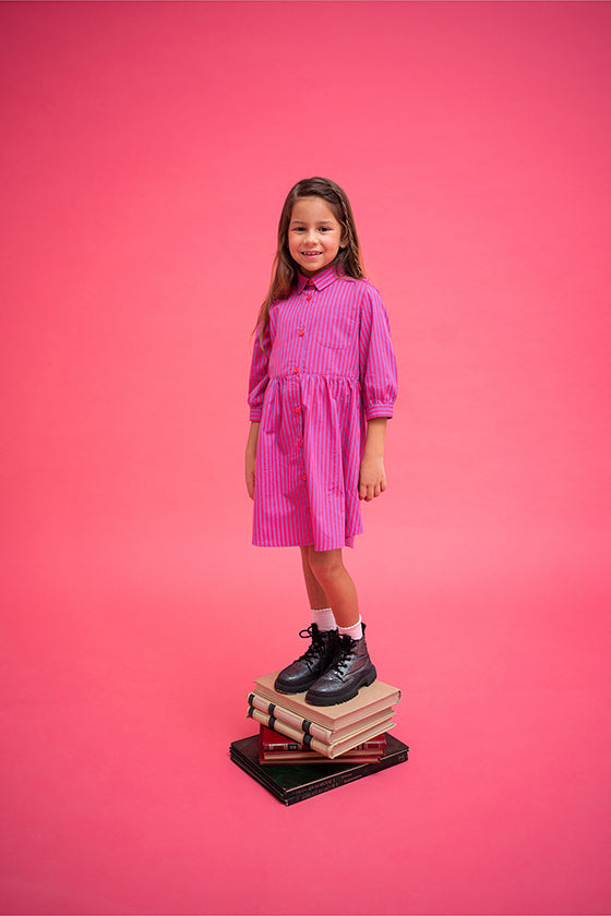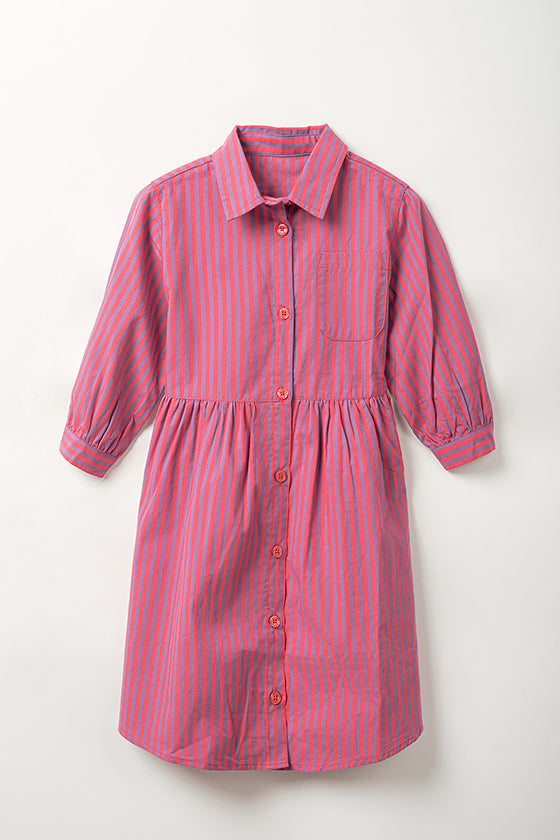 Vestido camisero para niñas con manga larga, estampado de rayas y abotonadura frontal Sophie. Incluye un bolsillo funcional y un diseño vibrante y relajado. Perfecto para días de juego en interiores o exteriores, este vestido combina estilo clásico con un toque divertido y moderno.